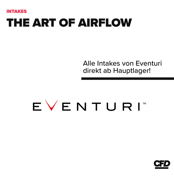 Eventuri setzt durch das eigens patentierte Verfahren einen neuen Maßstab im Bereich der Filtergehäuse. Dabei kann durch einen umgedrehten kegelförmigen Filter, welcher von einem Carbon / Kevlar Gehäuse umschlossen ist, ein gleichmäßig laminarer Luftstrom erreicht werden. Getreu dem Motto „The Art of Airflow“ können die Eventuri Ingenieure aus England somit echte Leistungssteigerungen, brutaleren Sound sowie ein besseres Ansprechverhalten garantieren!